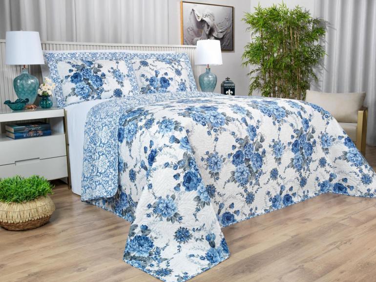 Kit: 1 Cobre-leito Casal Bouti de Microfibra Ultrasonic Estampada + 2 Porta-travesseiros - Gabriela Azul - Dui Design