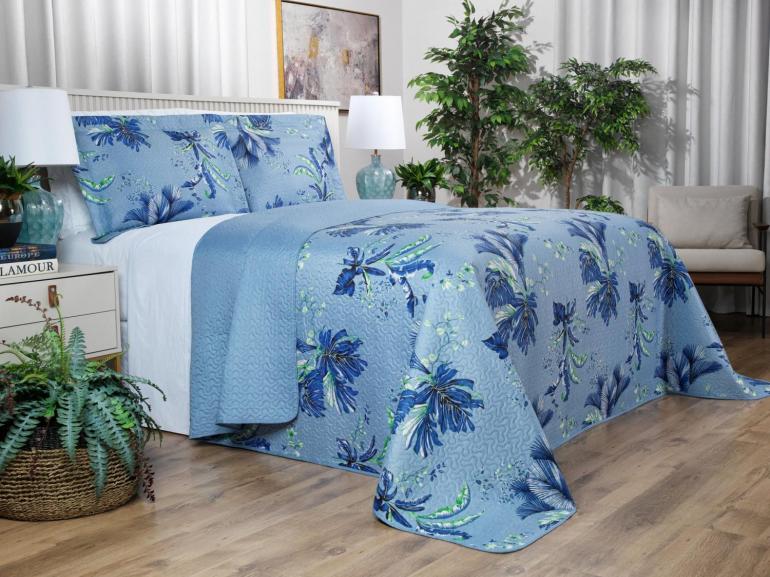 Kit: 1 Cobre-leito King Bouti de Microfibra Ultrasonic Estampada + 2 Porta-travesseiros - Eden Azul - Dui Design