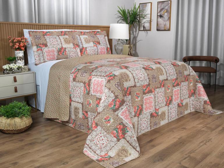 Kit: 1 Cobre-leito King Bouti de Microfibra Ultrasonic Estampada + 2 Porta-travesseiros - Mary Bege e Carmim - Dui Design