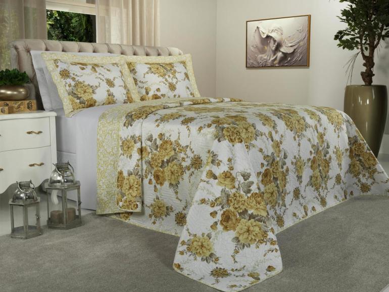 Kit: 1 Cobre-leito Queen Bouti de Microfibra Ultrasonic Estampada + 2 Porta-travesseiros - Gabriela Amarelo - Dui Design