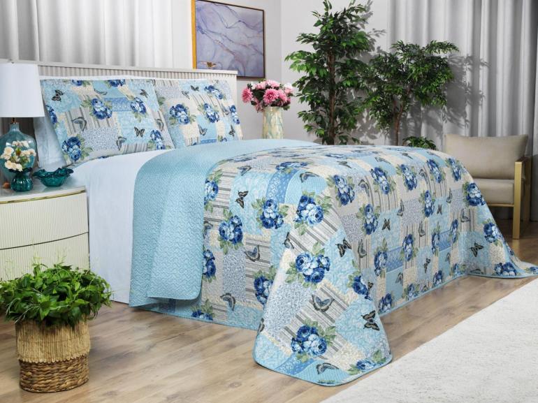 Kit: 1 Cobre-leito Queen Bouti de Microfibra Ultrasonic Estampada + 2 Porta-travesseiros - Paloma Azul - Dui Design