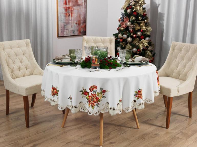 Toalha de Mesa Natal com Bordado Richelieu Redonda 175cm - Celebrare Natural - Dui Design
