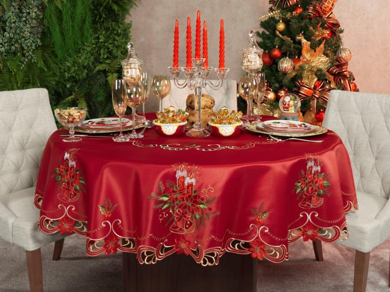 Toalha de Mesa Natal com Bordado Richelieu Redonda 175cm - Magia Vermelho - Dui Design